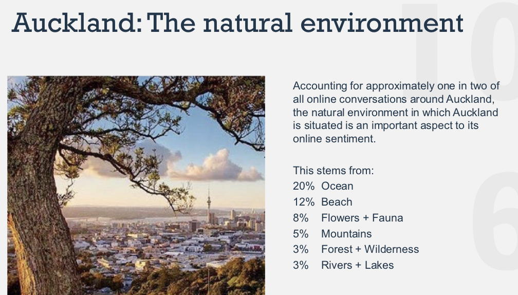 - Auckland brand has a very weak voice in the online discussion and needs to ramp up it's communications volume, it is about 1/6th the volume of Melbourne or Sydney.