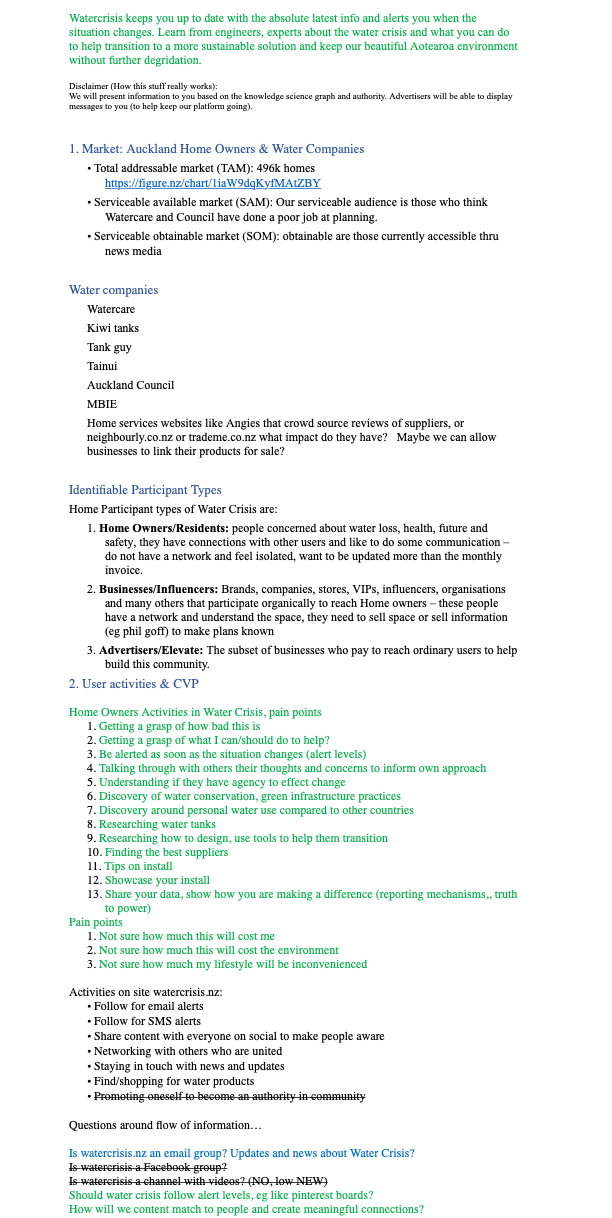 Have purchased the domain watercrisis.nz and undertaking research about community perspectives on water. The aim is to develop connections between those with a desire to avert a water crisis. I looked at some detail at other crisis management sites and applied a framework to thinking. A screenshot of the starting pages of the document is below for those interested in checking it out: