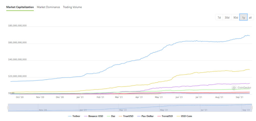 The stablecoin market cap has grown there are more than 60 now on the market. Some are exclusive to specific ecosystems, others popped into existence to support an underrepresented currency. The largest are Tether (USDT) and USD Coin (USDC) and they make up more than 75% of the market cap.